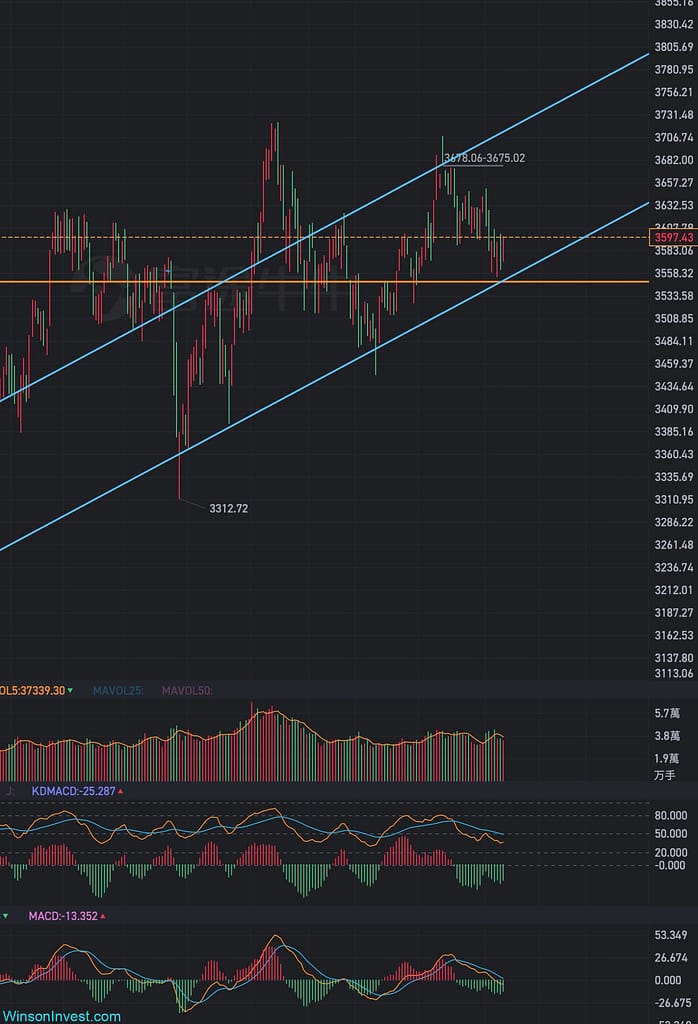 而上證指數也是到了一個KEY LEVEL有反轉的跡象,KDJ的D還未跌穿50,就看接下來K線會不會反轉向上在50附近形成金叉了;而MACD則到了0軸附近,通常MACD到了0軸都有很大機會能反彈一下的,就是不知道這力度夠不夠了;同時看整個上升通道,也剛好到了上升通道下沿反轉,所以整體走勢應該是看好的!