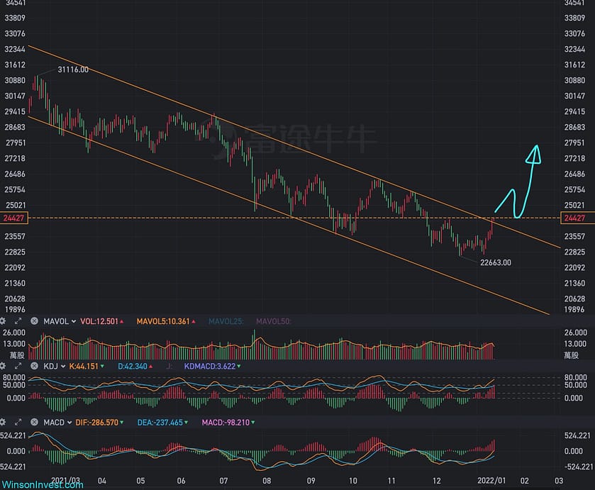 香港恆生指數從去年2月開始下跌,跌了整整1年!這幾天終於有一點點回暖的跡象了,今天更是升了600多點,看樣子準備突破長期下跌通道,如果能突破並企穩,就有很大機會繼續向上哦!