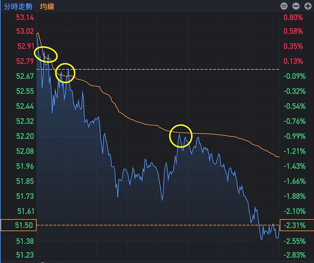 - 跌穿均線後回踩但不能再升穿,即要穿不穿的狀態,一般出現這情況都會有一個大跌跟住來的