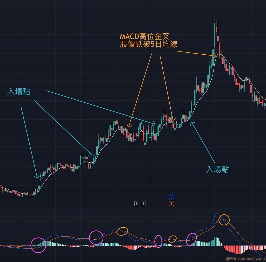 - 因為出場要儘量獲取最大利潤和最小的風險,所以我們可以使用 5 天均線來判斷
