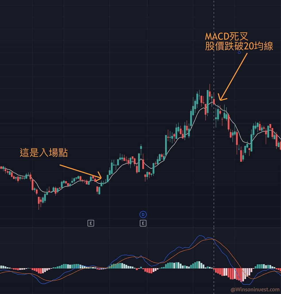 在這個例子中,在死叉當天還沒有跌破20均線,但在第二天就直接裂口低開了,這時候就應該要離場了,雖然這裏獲取不了最高利潤,但對比入場點和後市的大跌行情來說,也是一個很不錯的出場點了!