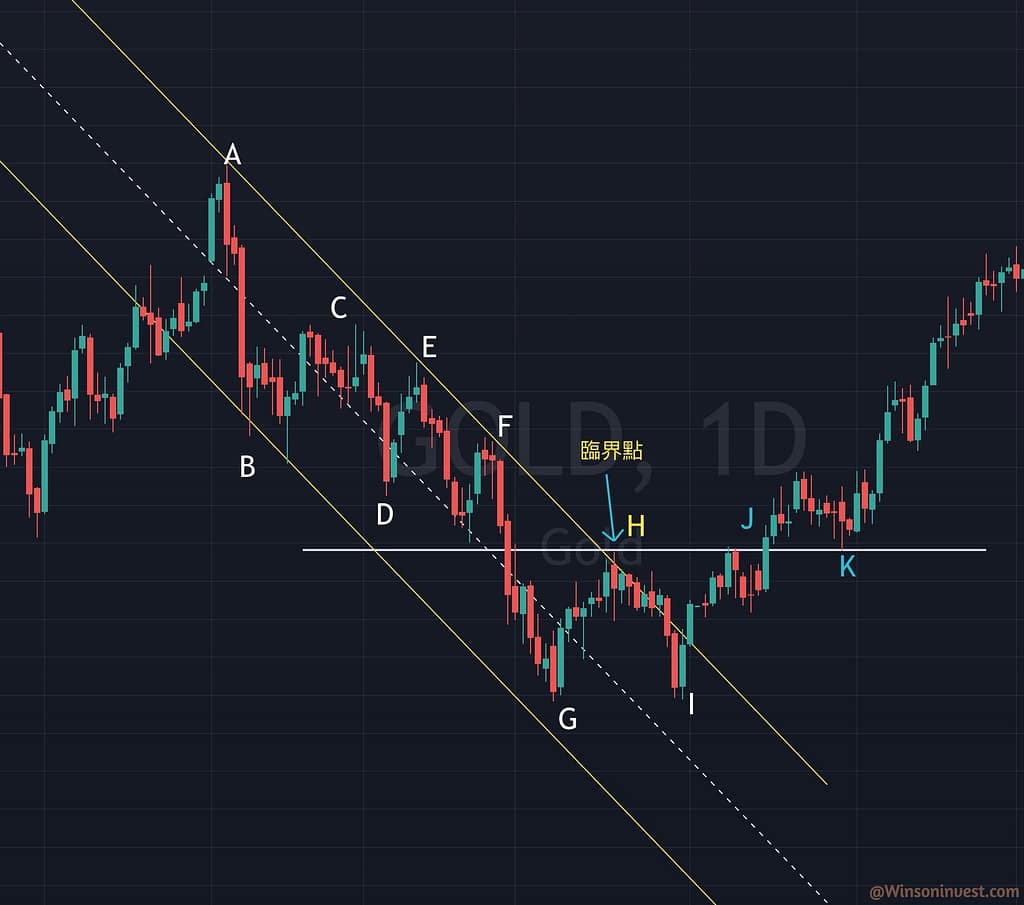 第九步:確立新的交易切入點。以下圖3是突破下降趨勢線後的行情,此時要等待價格再向上突破臨界點即H點才可考慮進行新的入場。所謂臨界點,即下降或上升趨勢中最後一個波峰。圖3中,如果是激進交易者,可在突破時即入場(J點),如果比較保守的話,可等再次回調到臨界點不破時入場,即K點