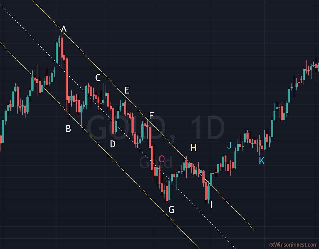 第一步:判斷趨勢。下圖是黃金日線走勢。從圖中可看出,從 A – E 點形已成了 Lower High & Lower Low的走勢,所以可以判斷為是下降趨勢