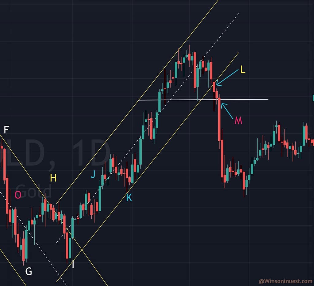 當新的交易產生後,就又是另一輪趨勢交易,以下圖4為例,原理與上面寫的步驟一樣,最終以向下跌破上升趨勢線為止盈,即 L 點,然後突破 M 臨界點後可再次做空